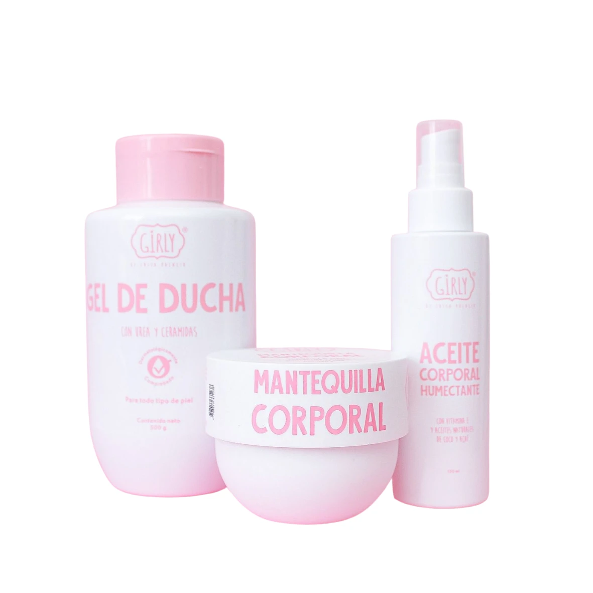 Kit corporal Girly Incluye todos los pasos para tu rutina corporal 1. Gel de ducha 2. mantequilla corporal 3. aceite corporal